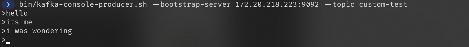 bin/kafka-console-producer.sh --bootstrap-server 172.20.218.223:9092 --topic custom-test