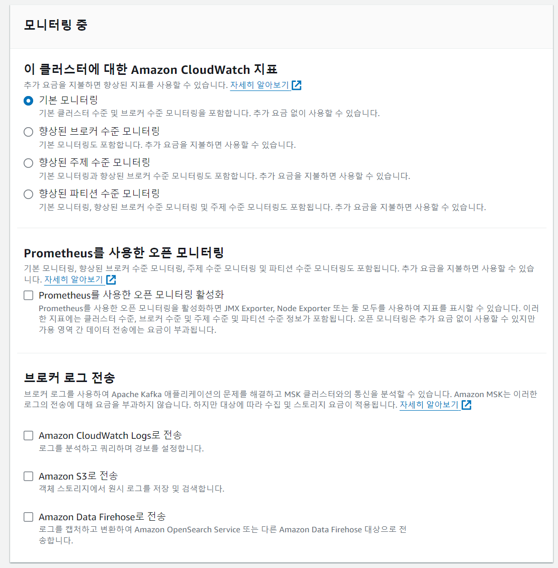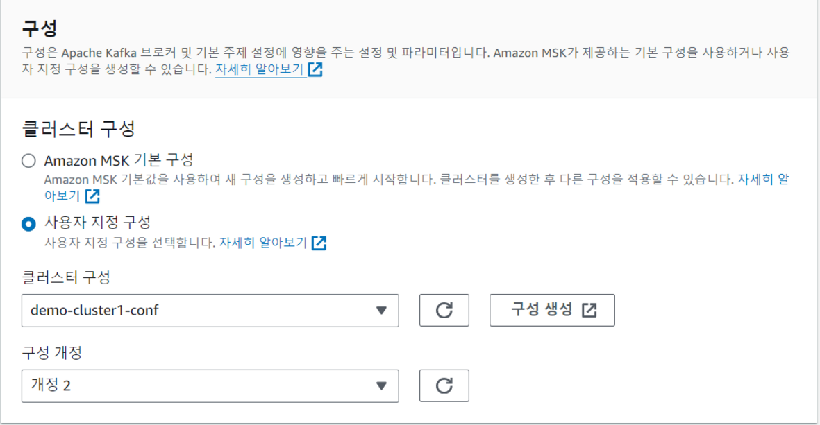 Amazon MSK 기본 구성을 클릭하면 디폴트 값으로 설정되는데 다음과 같다