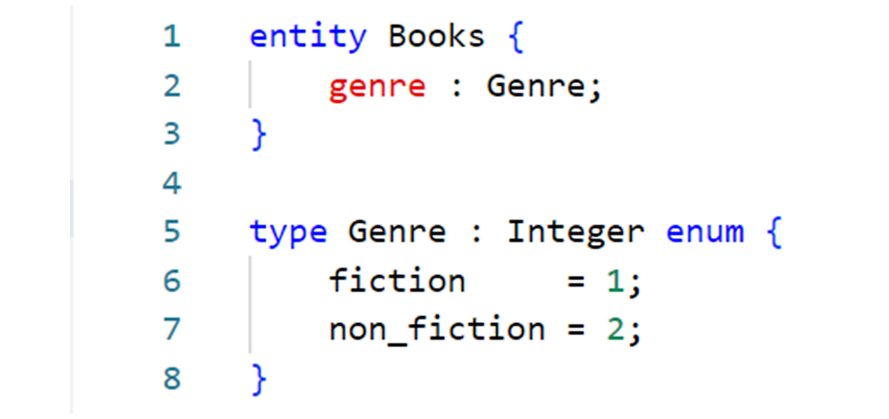 열거형 값을 정의하려면 type Status : Integer enum {Available = 1; Discontinued = 2;}와 같은 구문을 사용합니다.