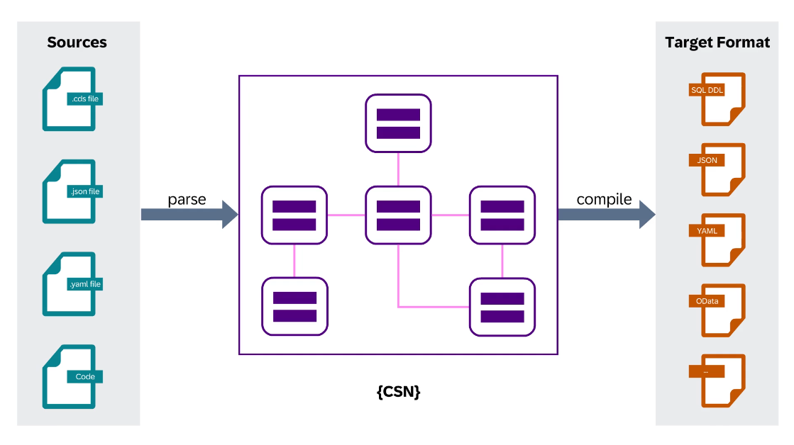 이번에는 CDS 모델의 소스와 타겟 형식에 대해 설명하겠습니다. CDS 모델은 Core Schema Notation (CSN)으로 표현되며, 모든 모델 처리 및 컴파일 단계는 CSN 객체를 기반으로 작동합니다.