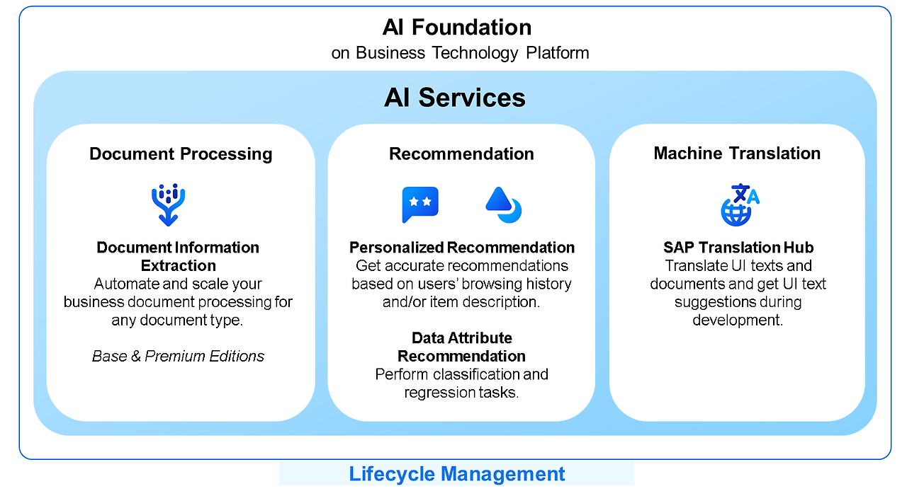 - SAP AI Services는 SAP Business Technology Platform(BTP)에서 제공되는 AI 기반 전략 서비스 및 애플리케이션입니다.