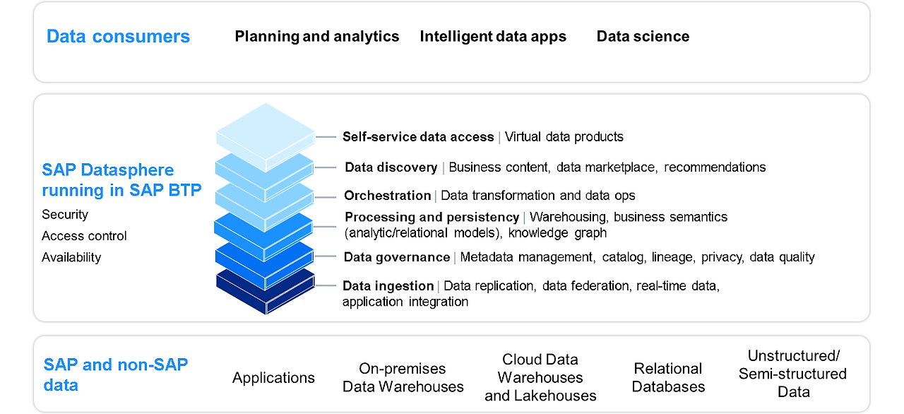 - SAP Datasphere는 통합 데이터 관리, 웨어하우징, 가상화 및 시맨틱 모델링을 통해 비즈니스 데이터 패브릭 아키텍처를 제공.