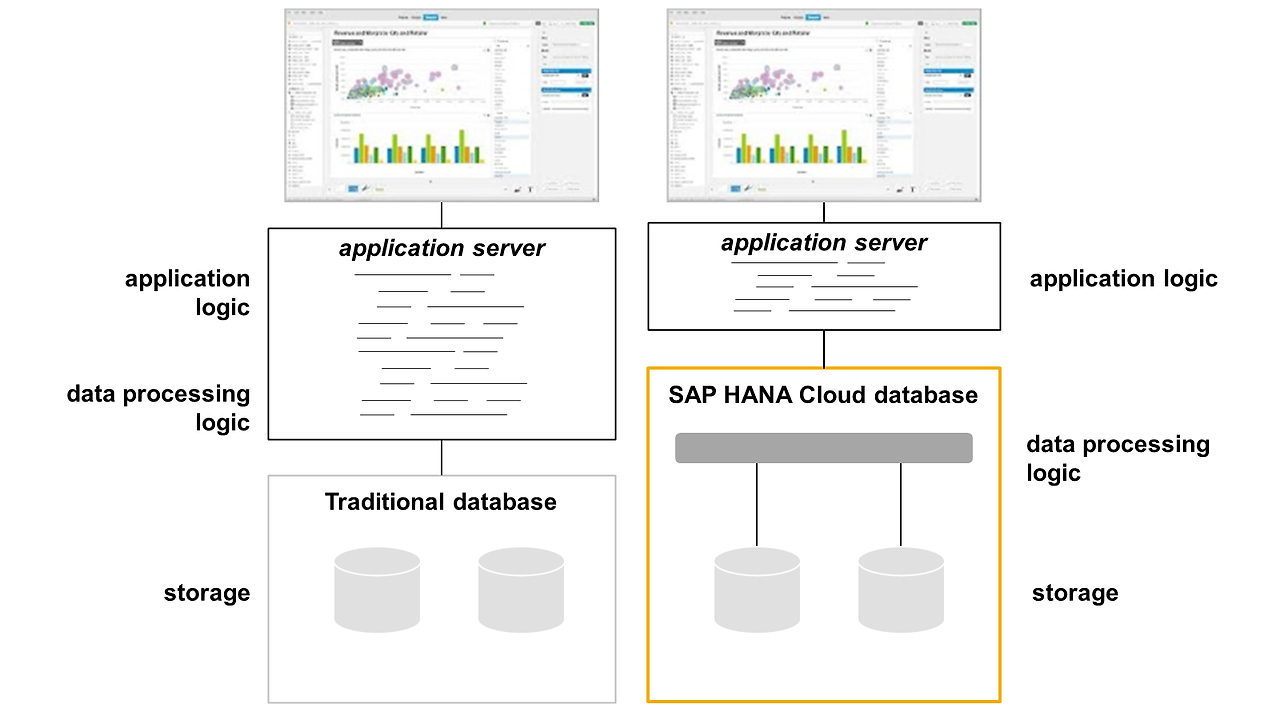 - 데이터 처리를 애플리케이션 계층에서 SAP HANA Cloud의 인메모리 데이터베이스로 이동.