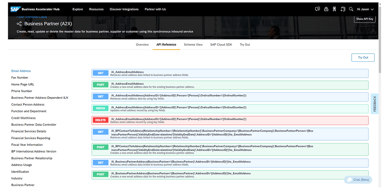 - SAP Business Accelerator Hub는 다양한 SAP 제품의 API를 탐색, 테스트, 활용할 수 있는 웹 애플리케이션.