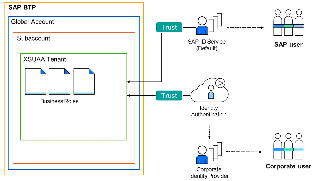 - SAP ID Service는 SAP BTP의 기본 IdP로 설정되어 사전 구성된 신뢰 연결을 제공.
