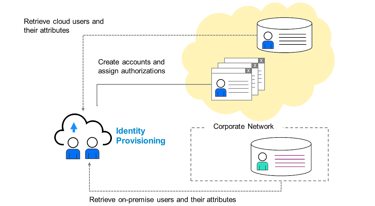 Identity Provisioning은 사용자의 계정과 권한을 클라우드 및 온프레미스 애플리케이션에 할당할 수 있도록 지원합니다.