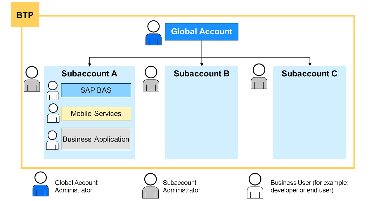 SAP BTP에서 글로벌 계정 관리자가 새 서브 계정을 생성하면, 시스템은 해당 관리자를 서브 계정의 관리자 역할에 자동으로 할당합니다.
