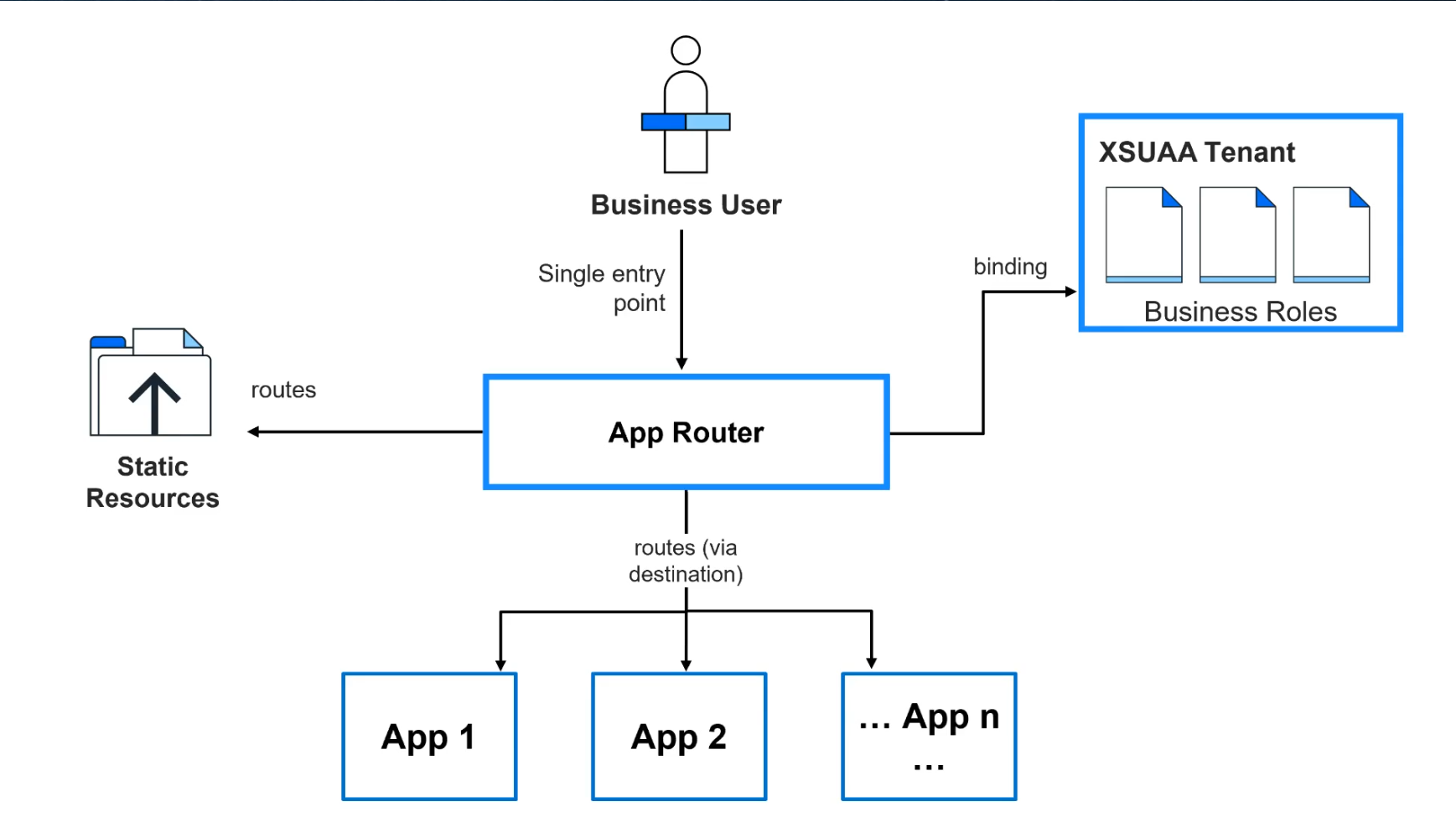 App Router는 SAP BTP에서 비즈니스 애플리케이션의 단일 진입점 역할을 하며, 다음을 수행합니다: